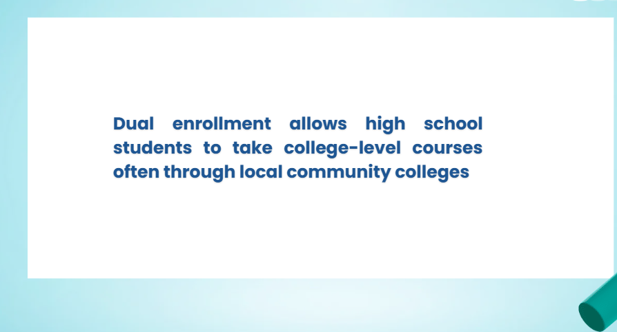 Dual enrollment allows high school students to take college-level courses often through local community colleges while still in high school. These courses count toward both high school graduation and future college credit.